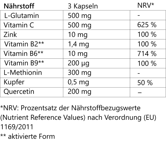 Zutaten: Magnesiumascorbat, L-Glutamin, Inulin, L-Methionin, Sophora japonica-Extrakt (98 % Quercetin), Zinkbisglycinat, L-Leucin, Pyridoxal-5-phosphat, Kupfer(II)-gluconat, Riboflavin-5-natriumphosphat, Glucosaminsalz der 5-Methyltetrahydrofolsäure (Quatrefolic®), Methylcobalamin. Kapselhülle: Hydroxypropylmethylcellulose.