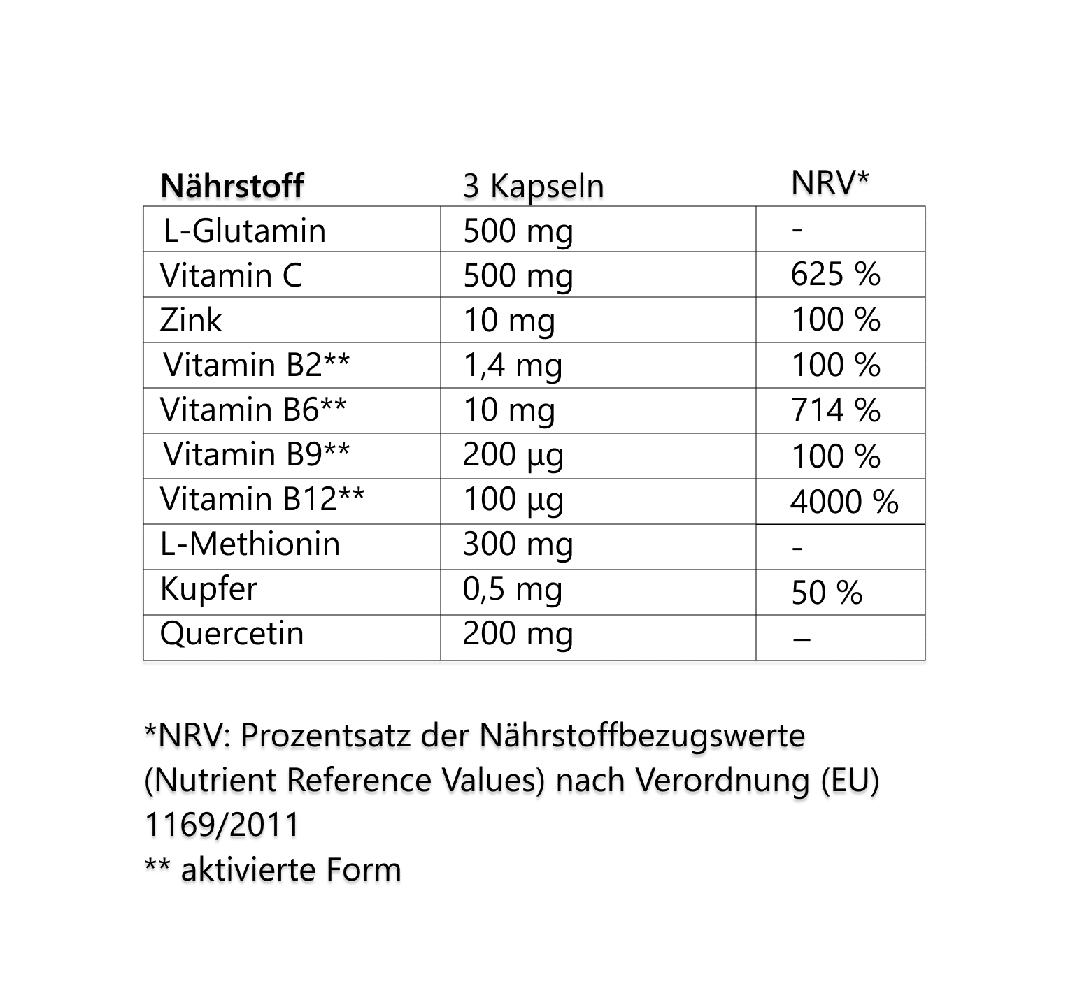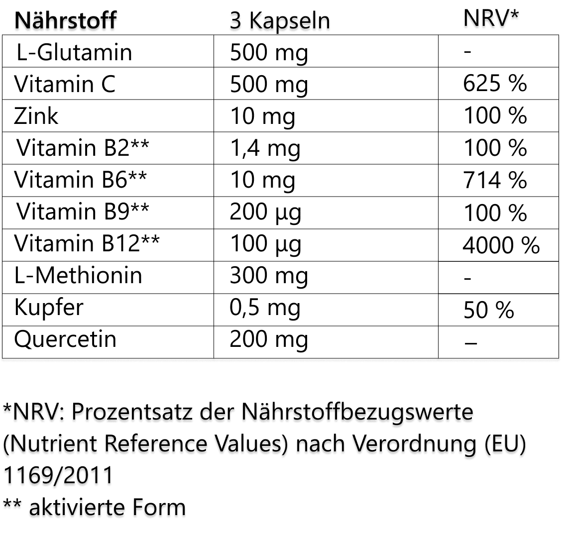 Zutaten: Magnesiumascorbat, L-Glutamin, Inulin, L-Methionin, Sophora japonica-Extrakt (98 % Quercetin), Zinkbisglycinat, L-Leucin, Pyridoxal-5-phosphat, Kupfer(II)-gluconat, Riboflavin-5-natriumphosphat, Glucosaminsalz der 5-Methyltetrahydrofolsäure (Quatrefolic®), Methylcobalamin. Kapselhülle: Hydroxypropylmethylcellulose.
